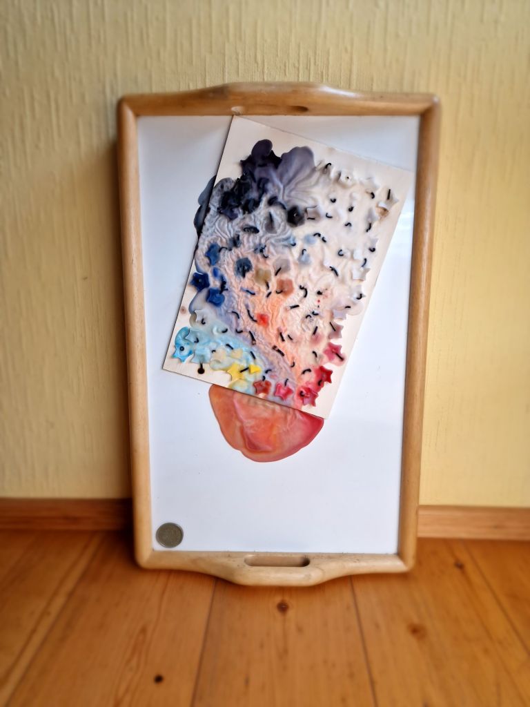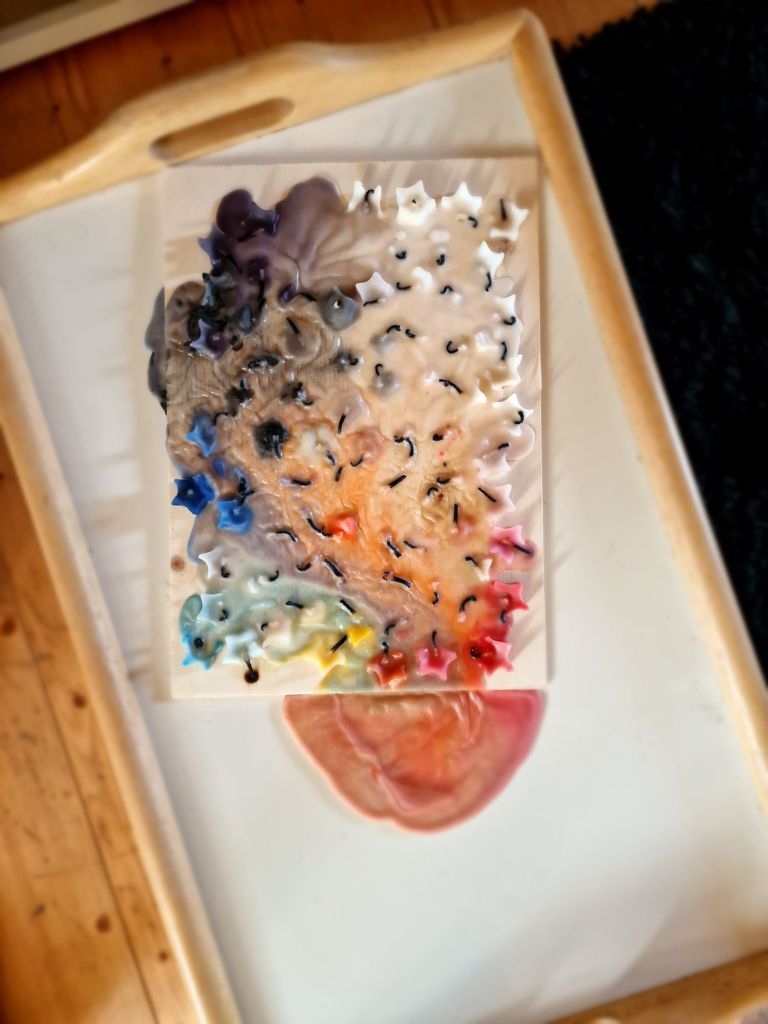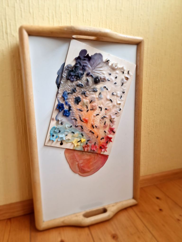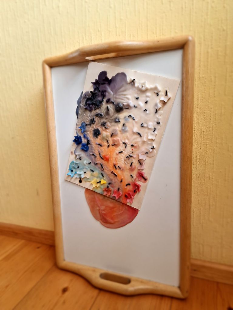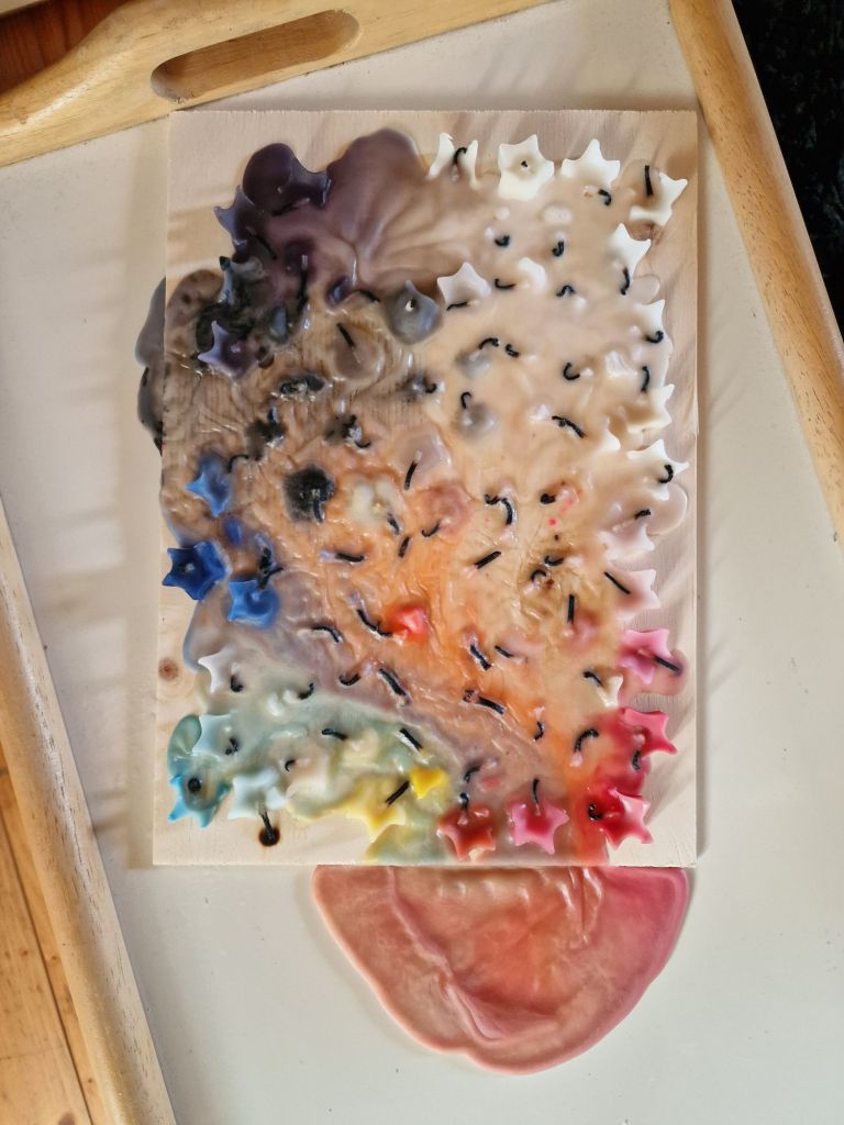 This piece, the entire tray itself is the universe at large. The wood plank that the candles have melted on, is a representation of Earth.