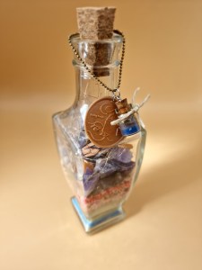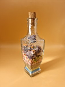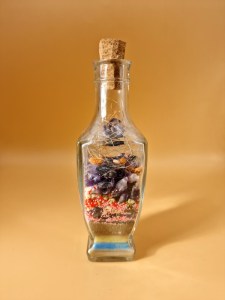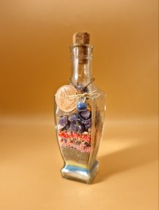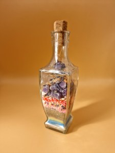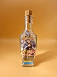 A one-of-a-kind work filled with vibrant colors and love in a bottle. Carefully poured wax layered with gold sand, amethyst stones from the undergounds of Germany and a waxed purple rose to finish the touch. ❤️